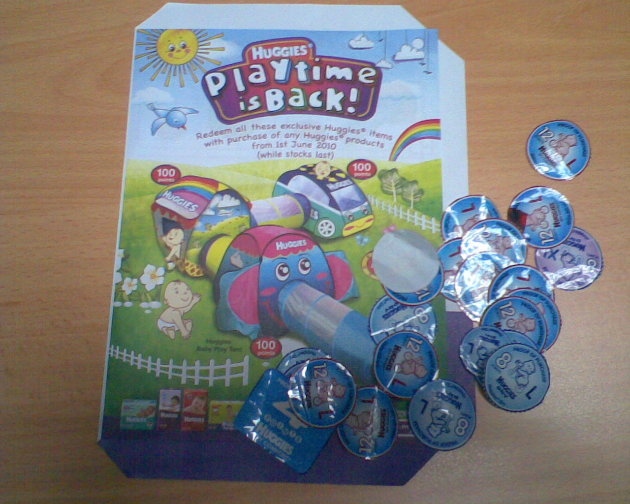 balik jer umah...saya ngan hubby apalagi..gotong-royonglah menggunting point2 tuh..kira-kira adalh jugak dlm 200++ point....biler saya check borang tuh bolehlah claim 3 set Huggies Baby Play Time (hehehe...ain baby lagi ker???at least leh simpan untuk adik ain nanti)